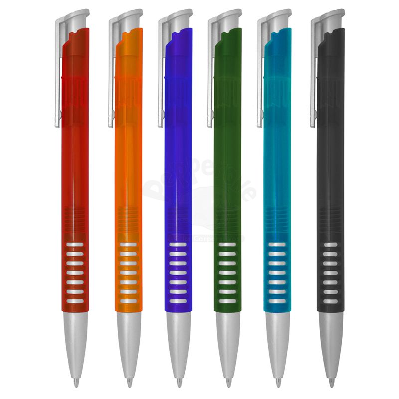 Personalizada Caneta de plástico com corpo transparente e colorido e detalhe em prata. Consultar as cores. Gravação silk