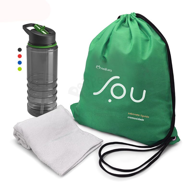 Kit fitness para presentes corporativos ideal para academias. Contém * 1 Saco de nylon * 1 Squeeze em plástico resistente com bico ajustável * 1 Toalha fitness.