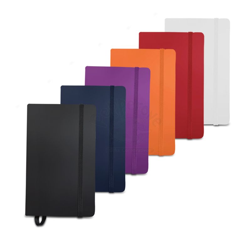 Bloco de Anotações com capa dura produzida em material SoftTouch, possui cantos arredondados, aproximadamente 80 folhas pautadas, marcador de páginas e elástico de fechamento.