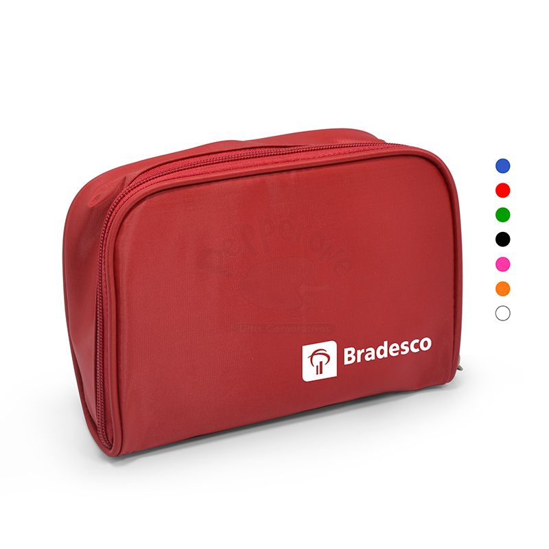 Necessaire com design tradicional para brindes corporativos. Confeccionada em nylon 70 plastificado, fechamento com zíper e reforçada com vivo nas costuras. Brinde de grande impacto para qualquer segmento. * Pode ser desenvolvida em diversas cores.