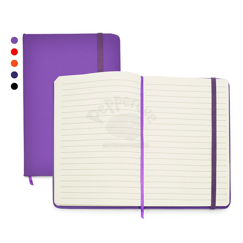 Bloco de Anotações capa dura revestida com material Soft Touch, possui aproximadamente 80 folhas pautadas amareladas, separador de páginas e elástico de fechamento.