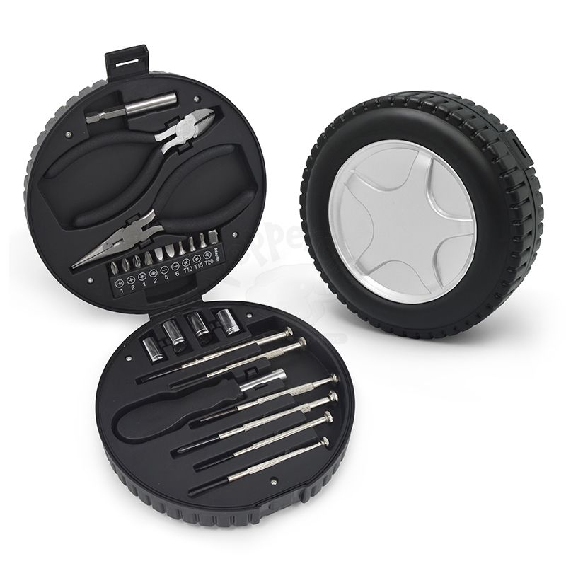 Kit ferramenta no formato de pneu para brindes personalizados. Contém: * 3 Chaves de Fenda * 3 Chaves Philips * 1 Alicate de Bico * 1 Alicate de Corte * 1 Chave de Canhão com extensor * 1 Jogo de Chaves com 9 unidades * 4 Bocais (7, 8, 9 e 10mm). Ideal para pequenos serviços de manutenção.