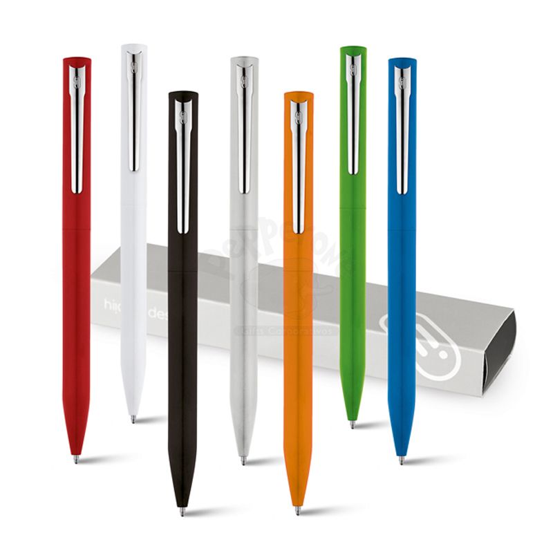 Caneta esferográfica em alumínio para brindes corporativos. Possui mecanismo twist, clipe em ferro com cromagem brilhante, corpo laqueado com revestimento brilhante, recarga de metal "tipo-Cross" e tinta Dokumental azul.