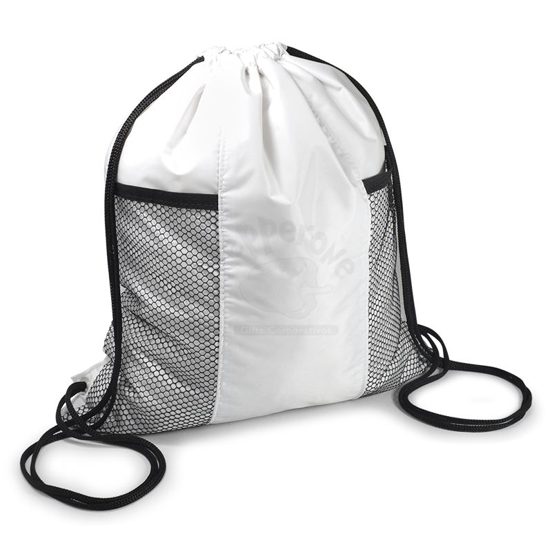 Mochila saco para dar de brinde. Confeccionada em nylon, com alça em cordão e rede frontal para armazenar objetos.
