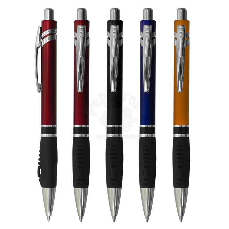 Caneta esferográfica plástica personalizada. Possui acionamento por clique, carga azul e apoio emborrachado para uma escrita confortável. Gravação em Silk.