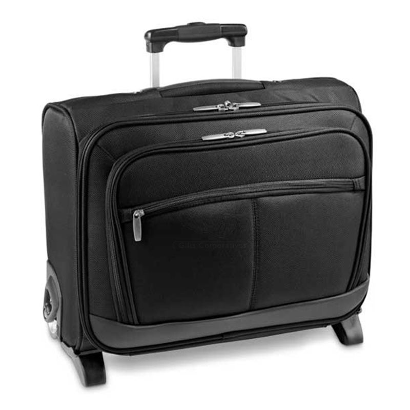 Mala para Notebook. Confeccionada em couro sintético e 1680D. Possui 2 rodas, caixa rígida, compartimento pra notebook 15,6", pega extensível em alumínio ( altura da pega estendida: 67,5 cm ) e interior forrada e almofadada. Chapa de metal: 3,9x 1,7 cm
