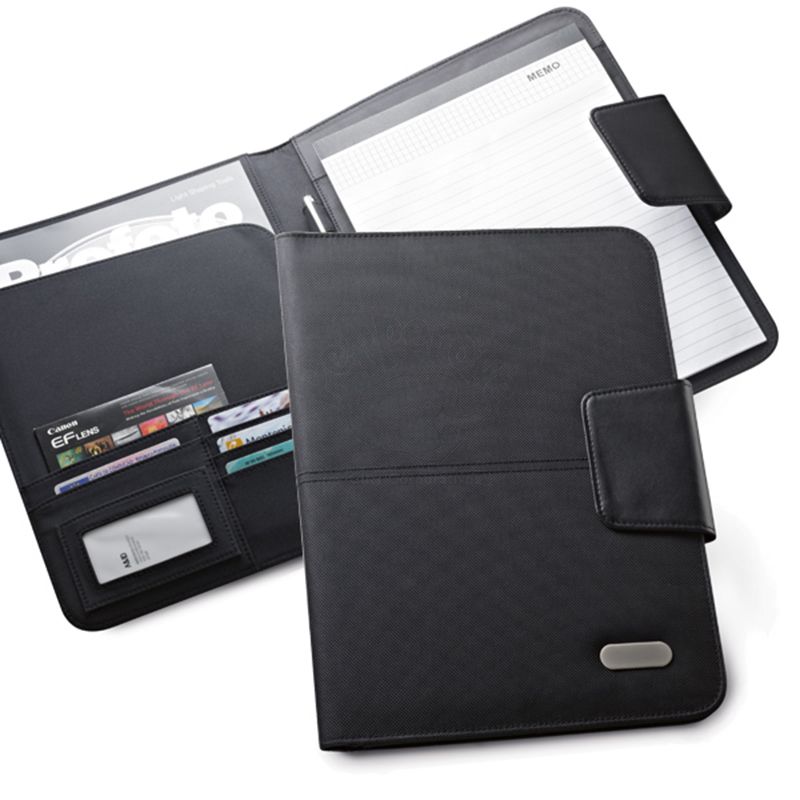Pasta A4. Confeccionada em couro sintético e 1680D. Possui fecho magnético. Bloco 20 folhas pautadas. Caneta esferográfica não inclusa. Chapa de Metal: 4,5 x 1,5 cm.
