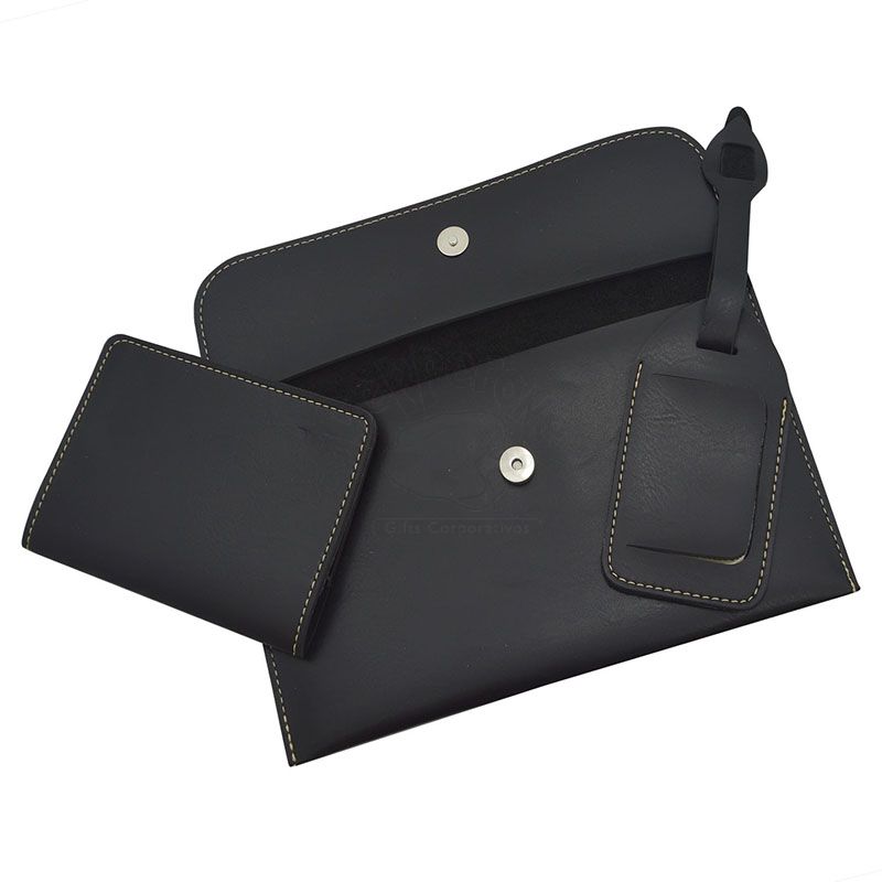 Possui 1 tag de identificação, 1 porta passaporte e 1 porta voucher. Gravação em baixo relevo.