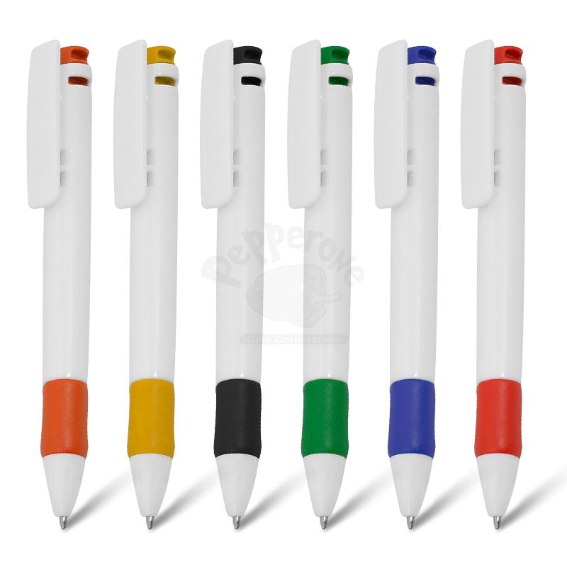 Possui ponteira esferográfica com carga azul, acionamento por clik.