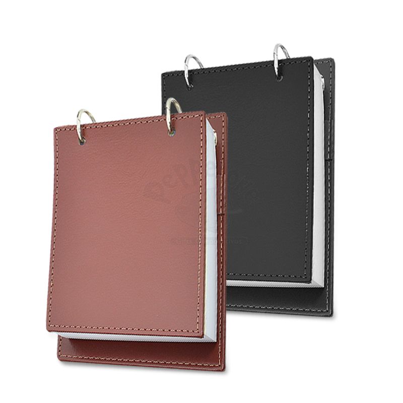 Porta bloco de anotações revestido em couro sintético com acabamento em costura na capa e na base. Possui 100 folhas não pautadas, suporte em metal para fixação/destaque das folhas e uma aba para porta caneta.