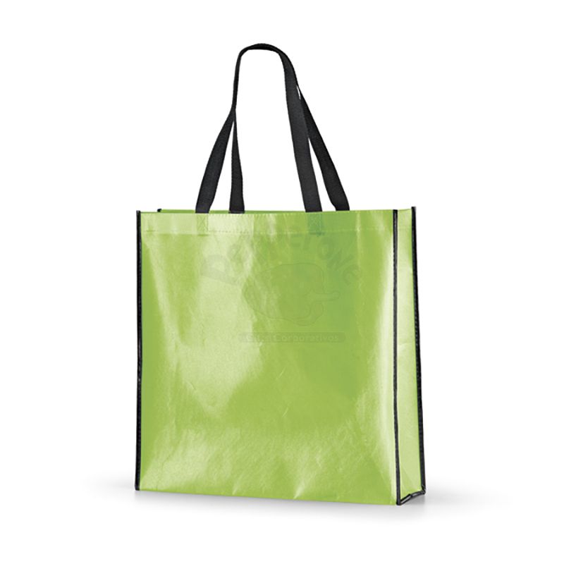 de 120 g/m² com laminação brilhante. Alças em webbing de 60 cm.