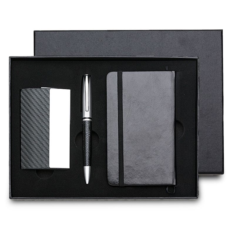 Kit Escritório com 3 peças em estojo de papelão com tampa e parte interna revestida de espuma. Contém: 1 porta cartão de couro sintético texturizado com detalhes prata brilhante, 1 caneta metal fosca com detalhe emborrachado preto com esferográfica azul e 1 bloco de anotações em couro sintético com aproximadamente 80 folhas amarelas pautadas. Acompanha placa metálica para gravação.