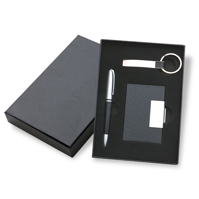 Kit Escritório com 3 peças, possui embalagem em estojo de papelão com tampa e parte interna revestida de espuma. Contém: 1 chaveiro metal fosco com detalhe emborrachado preto, 1 porta cartão de couro sintético(verso metálico liso) com placa de metal e 1 caneta de metal fosca com esferográfica na cor azul. Ideal para brindes personalizados e eventos corporativos.