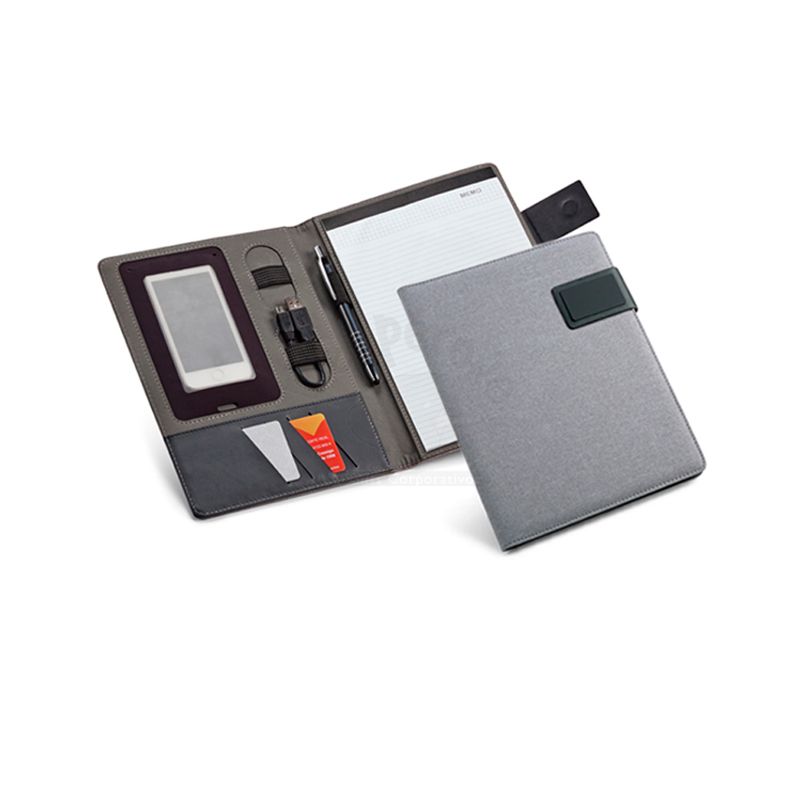Pasta A5. Linho sintético e couro sintético. Fecho magnético. Bloco: 20 folhas pautadas. Chapa metálica com acabamento aborrachado. Esferográfica não inclusa.