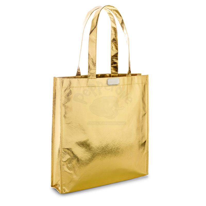 Sacola laminada personalizada produzida em Non-woven com laminação brilhante e alças para melhor transportá-la. gramatura de 95 g/m².