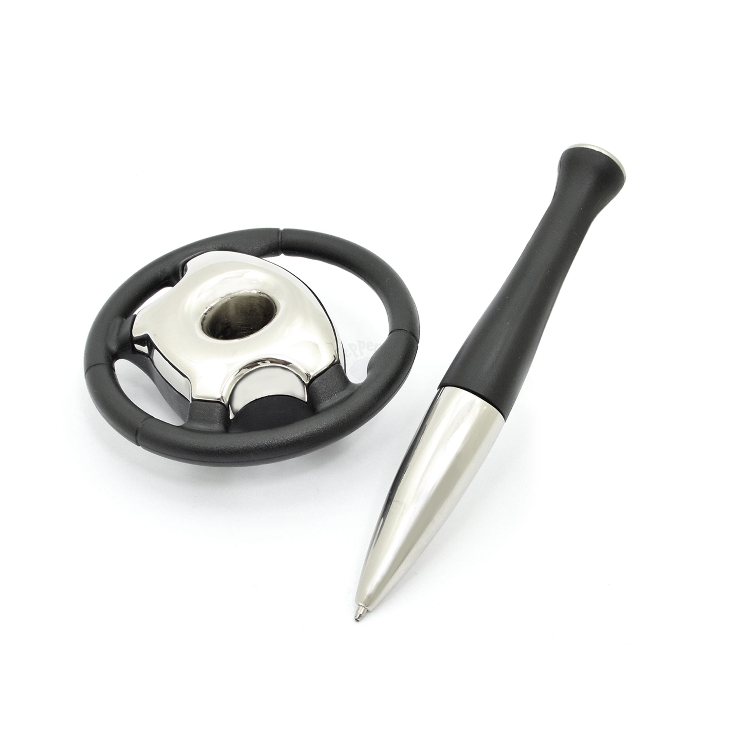 Porta caneta no formato volante de carro acompanhado de caneta esferográfica na cor preta com detalhes de metal.