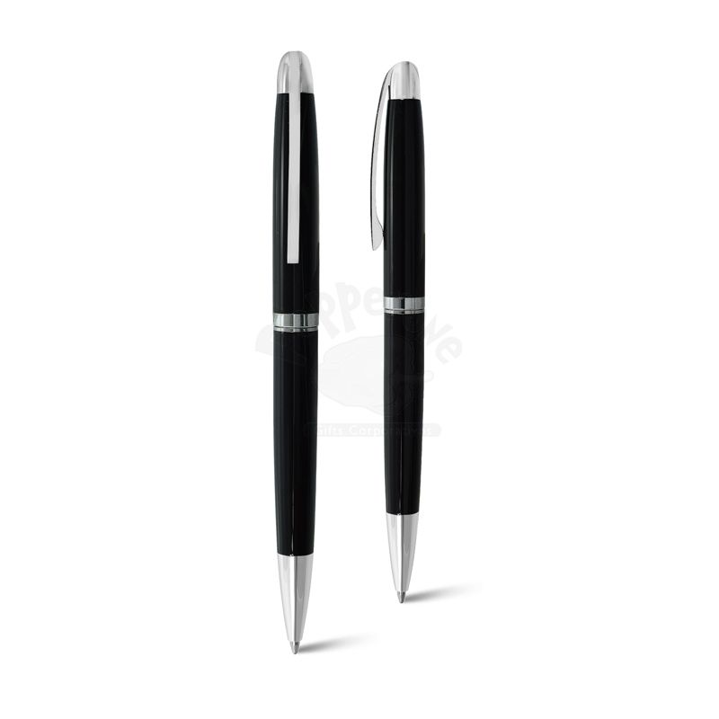 Caneta de metal com esferográfica azul e clip personalizado. Possui um escrita macia e confortável para uso no dia a dia.