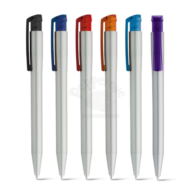Caneta plástica produzida em ABS com clip e click diferenciado, possui escrita esferográfica na cor azul que é exibida e recolhida através do mecanismo do click.