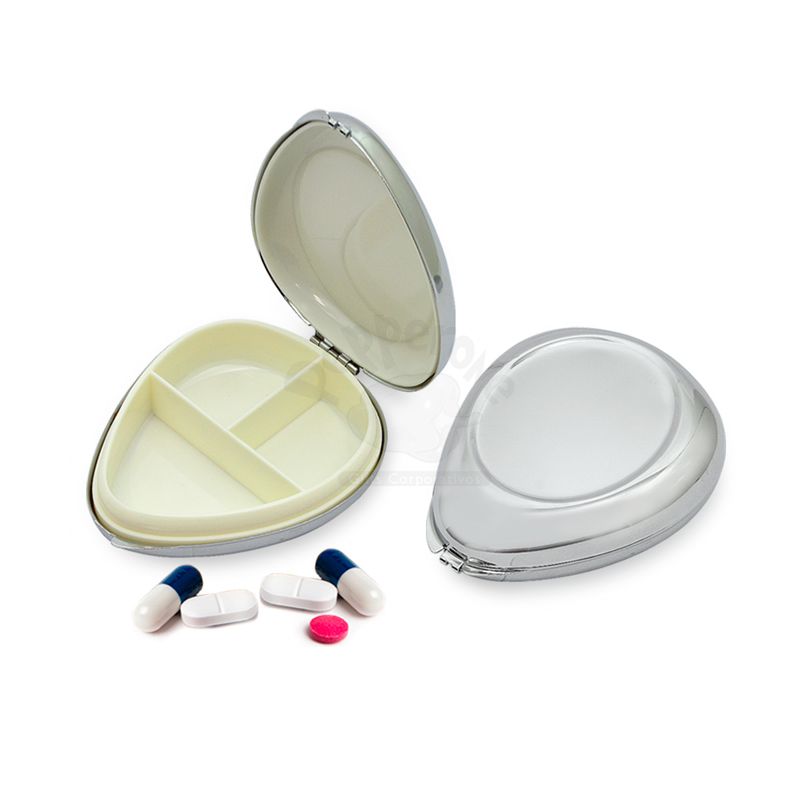 Porta comprimido de metal com tampa personalizada e 3 compartimentos para colocar comprimidos ou cápsulas. Ideal para brindes promocionais e eventos corporativos.