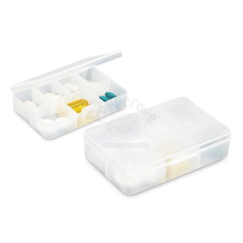 Porta comprimidos personalizado com tampa protetora e 7 divisórias. Ideal para brindes promocionais e ventos corporativos.