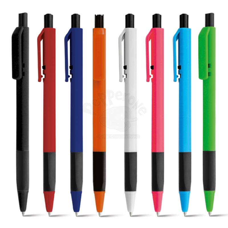 Caneta plástica produzida em ABS, esferográfica na cor azul que é exibida e recolhida através do mecanismo do click