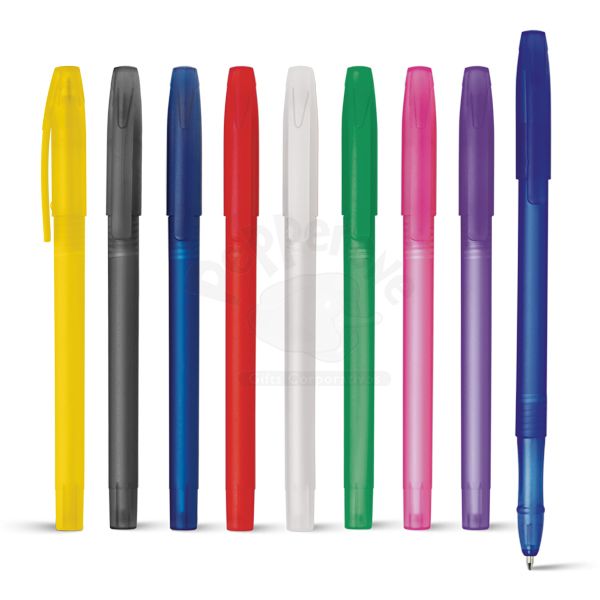 Caneta plástica produzida em ABS trnaslúcido fosco, esferográfica na cor azul com tampa e clip plástico.