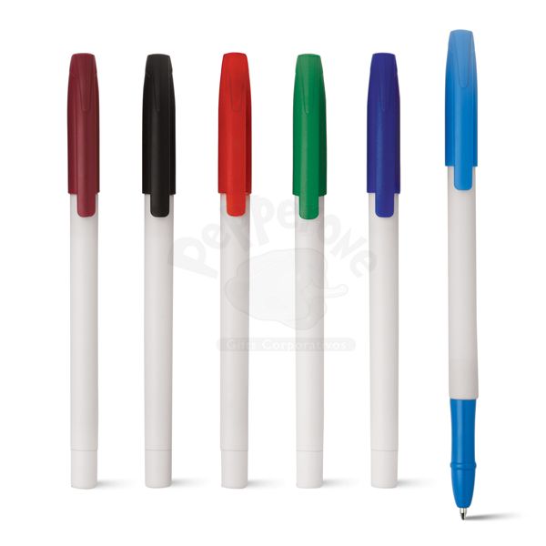 Caneta plástica produzida em ABS, esferográfica na cor azul com tampa e clip plástico personalizado.