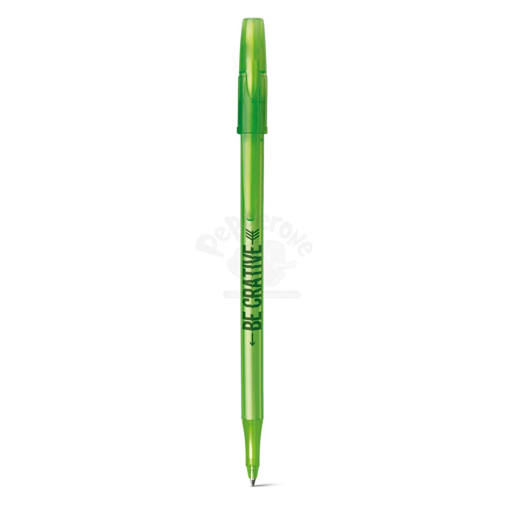 Caneta plástica produzida com acabamento personalizado, possui esferográfica na cor azul com tampa e clip personalizado.