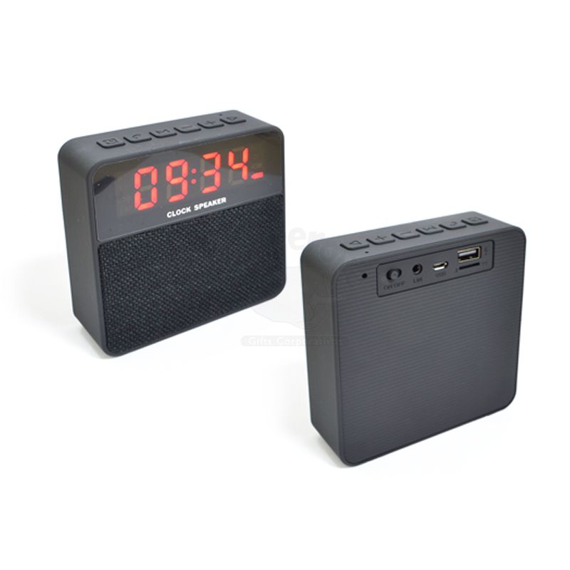 Possui botões de relógio, alarme, atender chamadas, microfone, teclas de volume, play, pause, tocar, microfone, entrada para cartão TF- microSD, rádio FM e modo Bluetooth. Entrada USB, entrada DC 5V, bluetooth V.42, distância de alcance 10Mt, recarg aproximada de 2 à 3 horas, frequência de resposta 280HZ-16KHZ e potência de bateria 1200mA. Acompanha cabo USB e manual de instrução.
