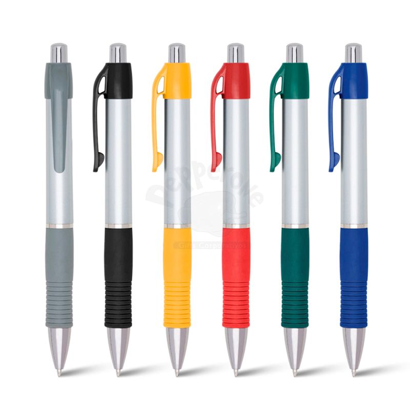 Produzida em plástico com detalhe emborrachado que proporciona uma escrita macia e confortável, possui clip personalizado e sistema de acionamento da ponteira através do click.