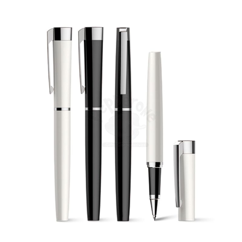 Caneta roller de metal personalizada com acabamento fosco, detalhe personalizado na parte superior da caneta, tampa destacável, esferográfica na cor azul e clip de metal .