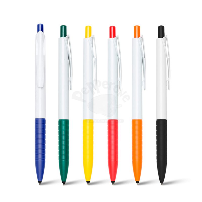 Caneta plástica personalizada com detalhe emborrachado, possui acabamento personalizado além de contar com uma ponteira touch para uso exclusivo em seu tablet ou smartphone. Com dois estágios, um ponteira touch e outro com caneta esferográfica azul.