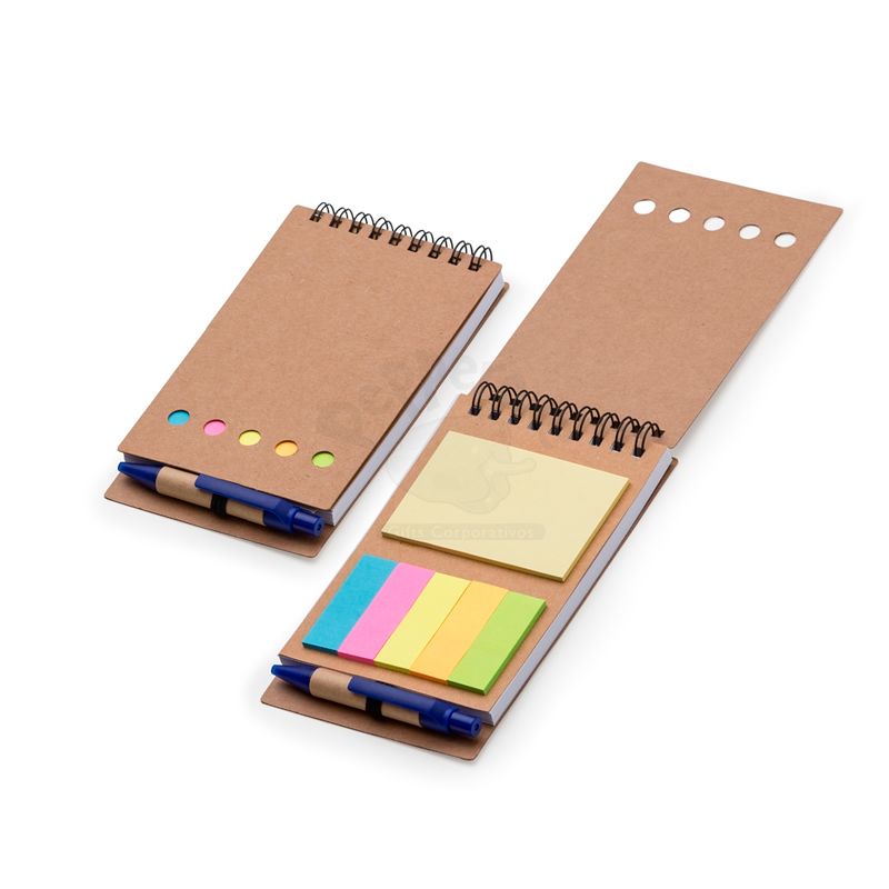 Bloco de anotações ecológico com espiral produzido em material kraft. Possui uma mini caneta de papelão com acabamentos plásticos, cinco blocos autocolantes coloridos, um bloco de autocolantes amarelo e um bloco com aproximadamente 70 folhas brancas pautadas.
