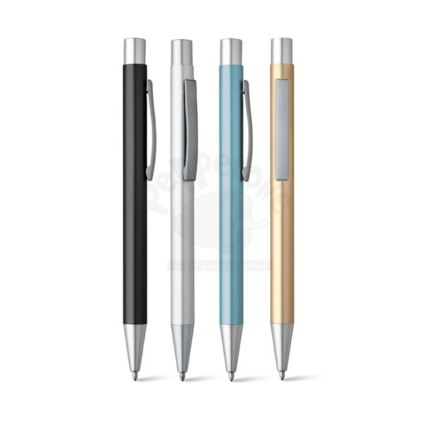 caneta de metal com acabamento metalizado, possui clip diferenciado, sistema de acionamento da ponteira por click e uma escrita macia e confortável.