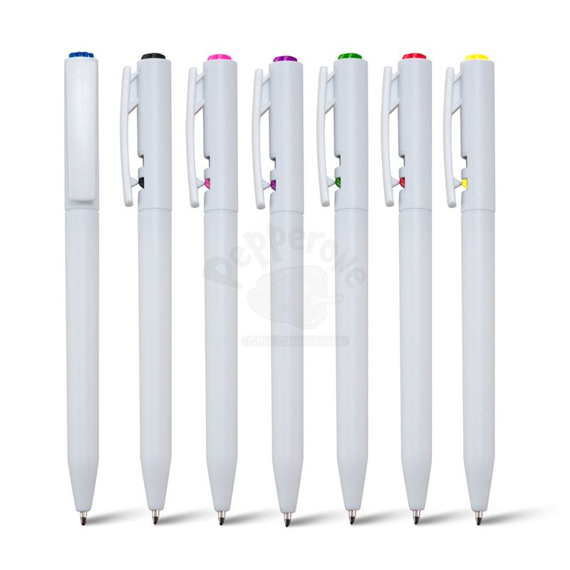 Caneta plástica personalizada com detalhe colorido, possui clip injetado e acionamento da ponteira na parte superior da caneta.