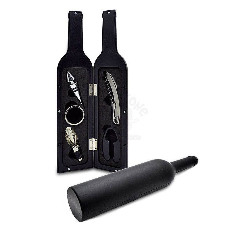Kit Vinho 5 Peças Promocional Kit vinho 5 peças personalizado em forma de garrafa, com abertura lateral. Possui 1 saca rolha, 1 corta gotas, 1 tampa de bico, 1 bico para servir e 1 cortador de lacre para vinho.