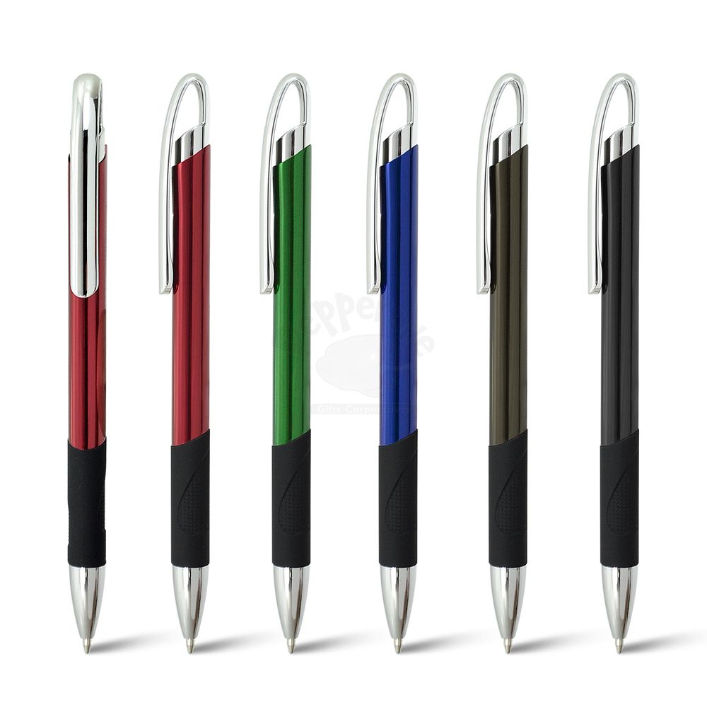 Caneta de metal promocional, possui esferográfica na cor azul, detalhes no corpo da caneta emborrachado que assegura a escrita deixando mais firme e confortável. Seu acionamento é através do clip da caneta.