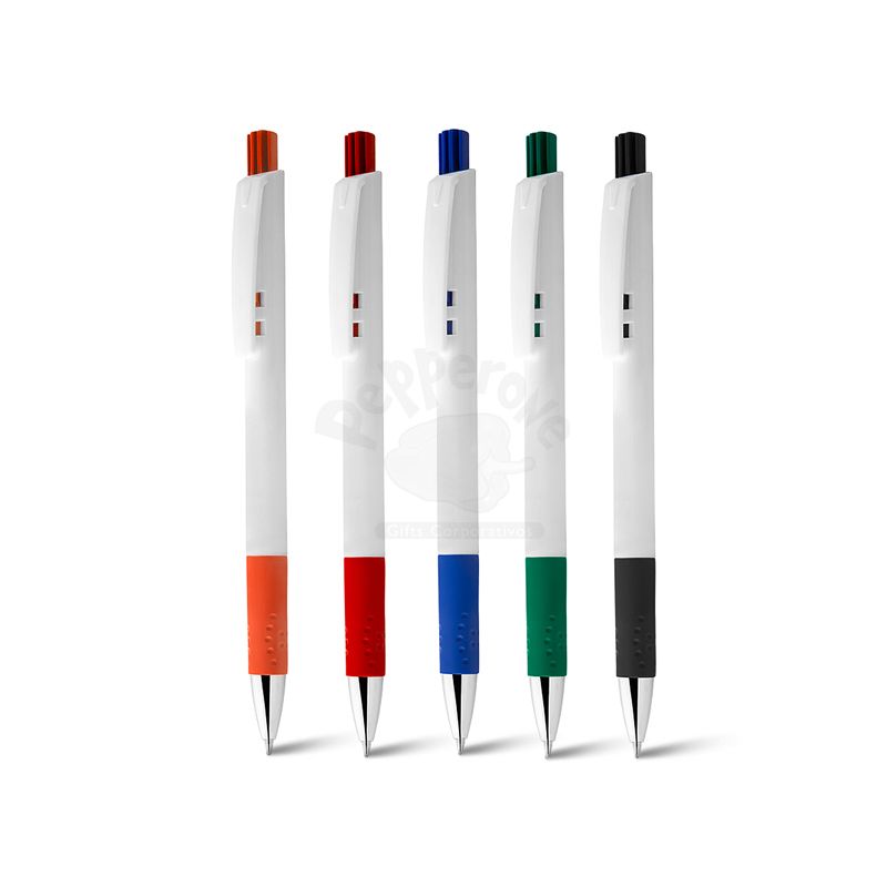 Caneta plástica personalizada com detalhe colorido, possui clip injetado e acionamento da ponteira na parte superior da caneta.