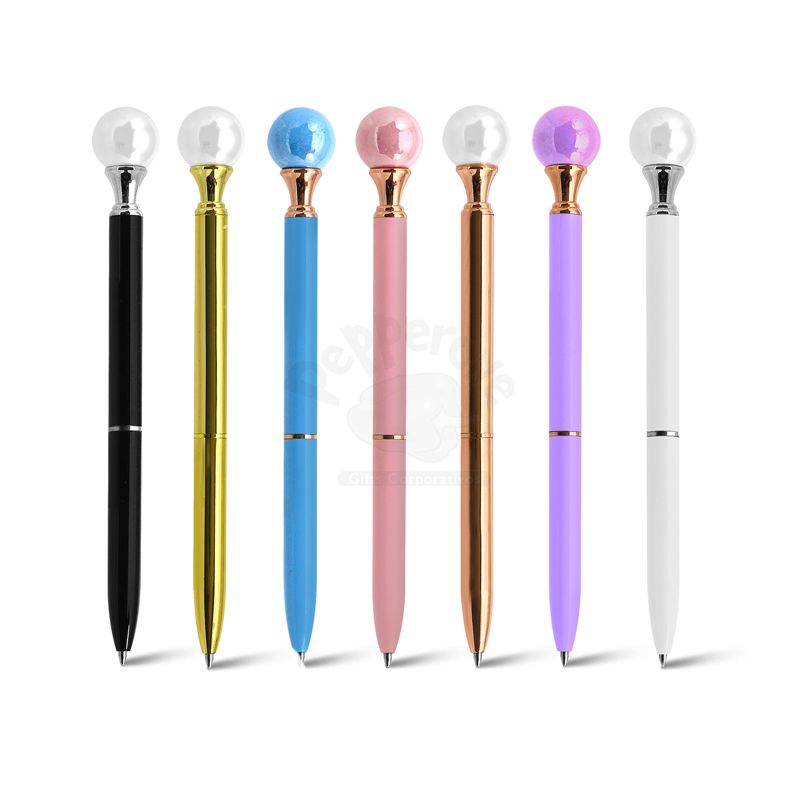 Caneta de metal personalizada com detalhe similar a uma pérola na parte superior da caneta. Possui um anel no corpo e escrita na cor azul acionada através do sistema giratório. Ideal para brindes personalizados e eventos corporativos.