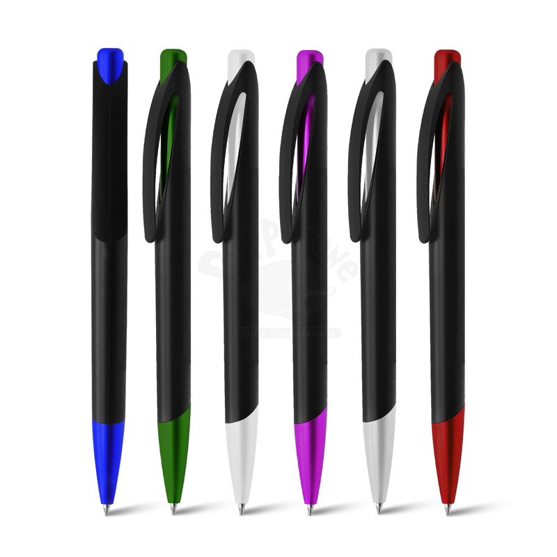 Caneta plástica personalizada, possui acionamento da ponteira na parte superior por clique, esferografica na cor azul e clip de plástico. Ideal para brindes personalizados e eventos corporativos.