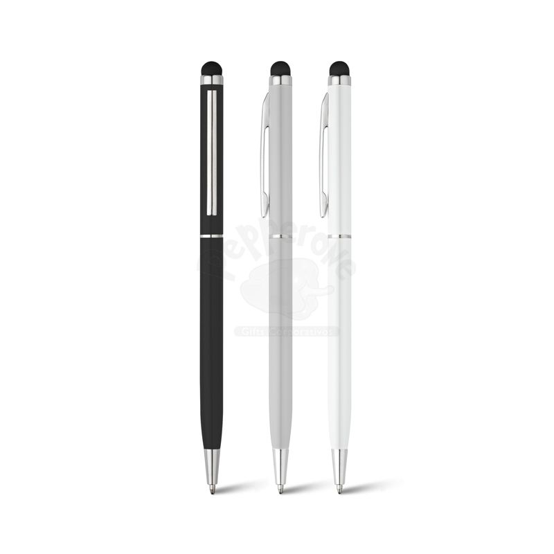 Caneta de metal personalizada modelo Slim, possui ponteira touch com acionamento giratorio da escrita na cor azul. Ideal para brindes personalizados e eventos corpoativos.