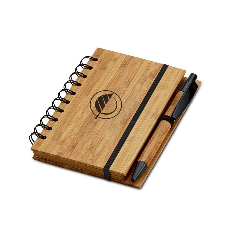 Bloco de anotações produzido em bambu com capa dura, possui elástico para fechamento, wire-o de metal, caneta esferográfica em bambu com acionamento por clik e 70 folhas pautadas de papel reciclado.