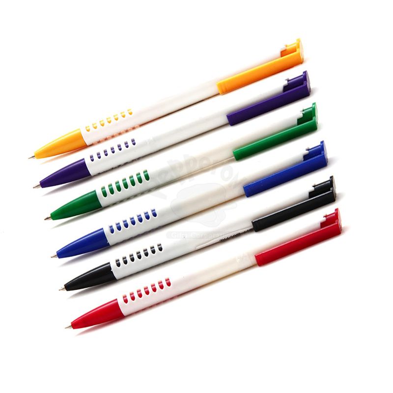 Promocional Caneta de Plástico com click injetada com corpo branco e detalhe coloridos.