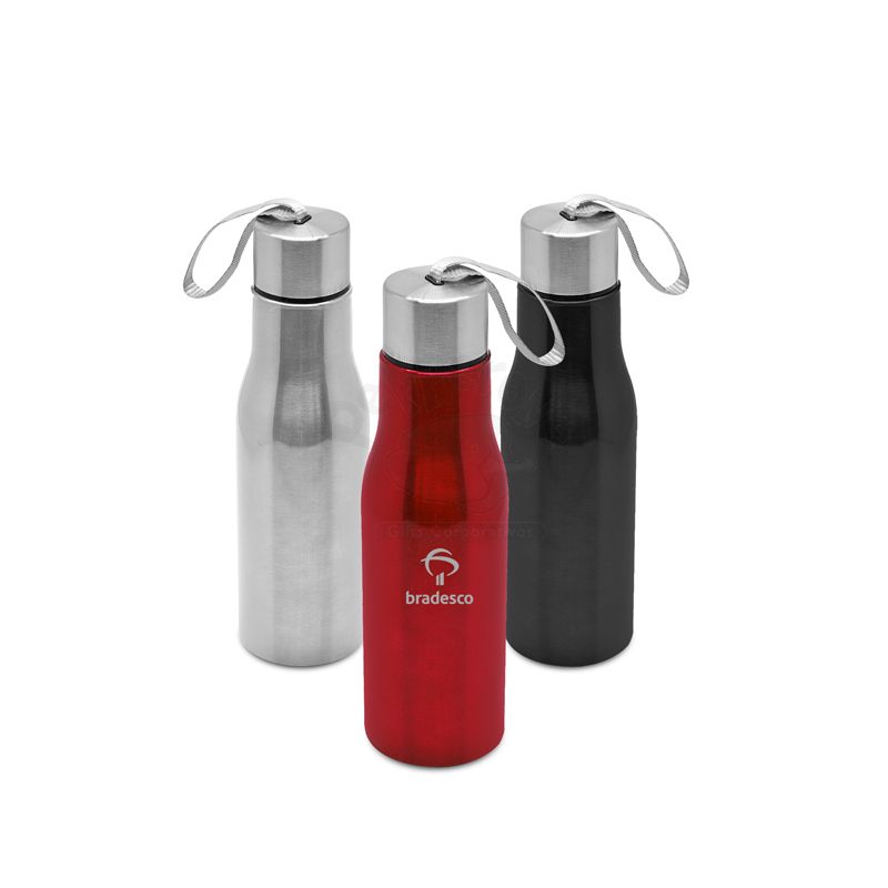 Garrafa personalizada produzida em metal com capacidade para 750 ml, possui tampa rosqueavel com sistema anti derrapante e alça de tecido para transporte. Ideal para divulgar sua empresa em eventos corporativos, brindes personalizados e campanhas promocionais.