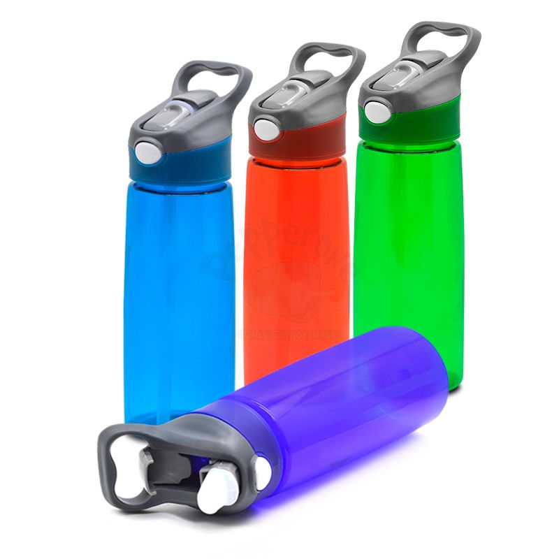 Squeeze plástico personalizado com acionador automatico. Possui alça de mão, tampa protetora rosqueável, botão acionador automático do bico, bico em silicone atóxico e corpo plástico com capacidade para 650ml. Ideal para divulgar sua empresa em eventos corporativos, brindes personalizados e campanhas promocionais.