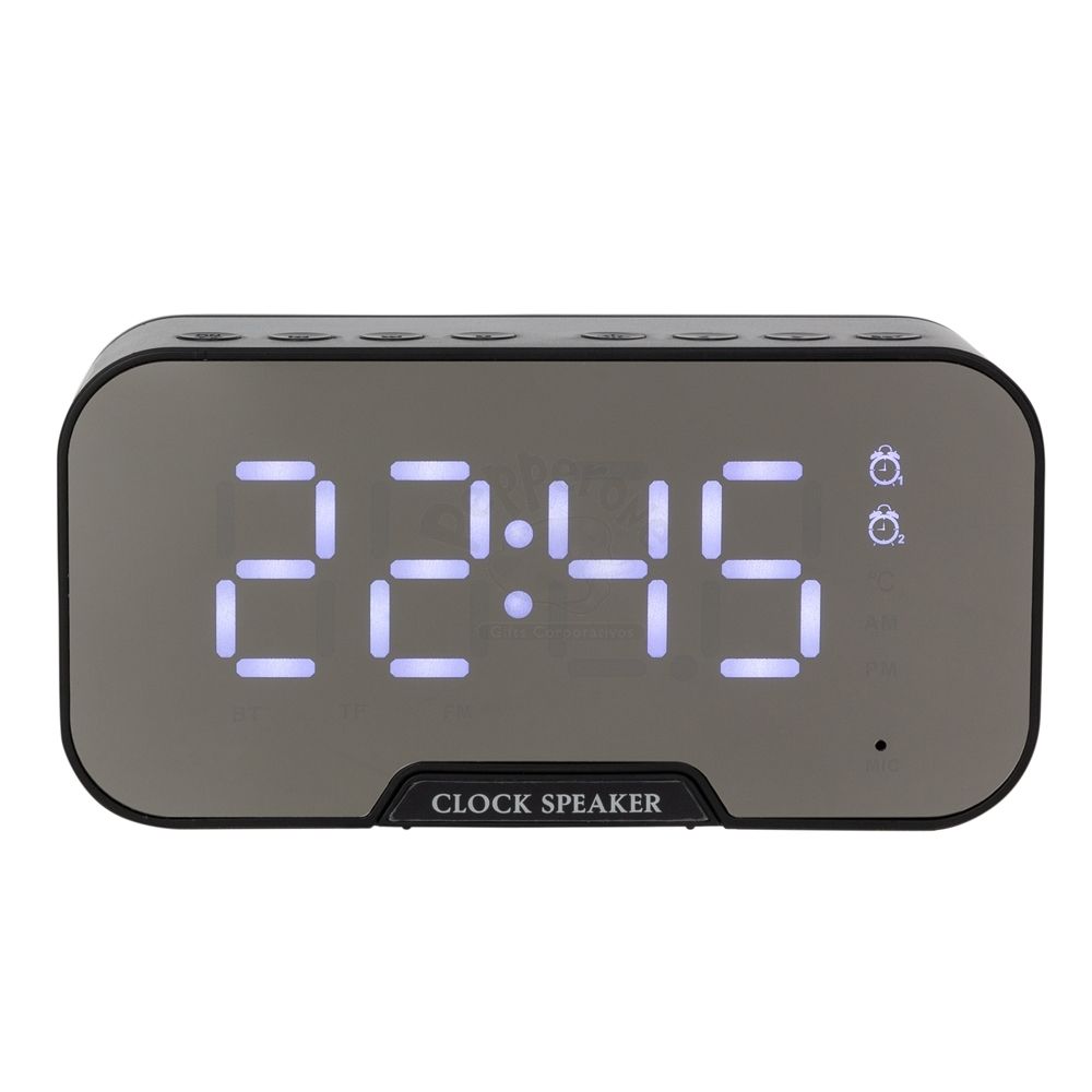 Caixa de som com relógio personalizada produzida em plástico com detalhes de borracha. Possui display de LED, base antiderrapante, botões de controle na parte superior para alternar o volume, as faixas, os modos, play e pause, liga e desliga, os botões < e > ao serem pressionador durante o modo de configuração, irão ajustar o relógio, despertador e toque do alarme e o botão SET ao ser pressionado irá alterar entre as opções . A caixa de som executa nos modos bluetooth, rádio FM, cartão TF-microSD (até 16GB) e entrada auxiliar P2, Suporte para celular, Bluetooth V 5.0; Frequência de resposta 80Hz-20KHz; Frequência de rádio 87.5MHz-108MHz; Bateria de lithium 3.7V com 1400mAh; Distância de alcance 10 metros; Voltagem DC 5V; Falante SNR e distorção <0,5% . Acompanha cabo USB e manual em inglês. Ideal para brindes, distribuição em eventos e campanhas promocionais.