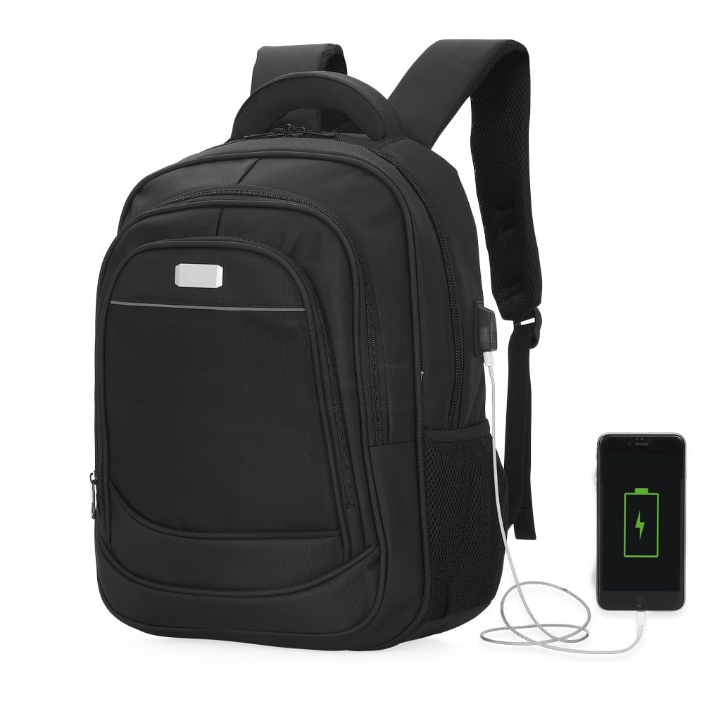 Mochila para notebook personalizada produzida em poliester Jacquard com três compartimentos. Possui compartimento interno para notebook de até 15''Pol, parte interna forrada com nylon 210, zíper reforçado, divisórias para canetas e objetos pessoais, dois bolsos laterais com elástico, bolso frontal com faixa refletiva, placa de metal para personalização, entrada diferenciada lateral para USB permitindo carremamento de smartphones, alça de mão, alças ajustáveis, acabamento acolchoado para melhor conforto nas costas e bolso traseiro antifurto. Ideal para brindes promocionais e eventos corporativos. Objetos decorativos não acompanham o produto.