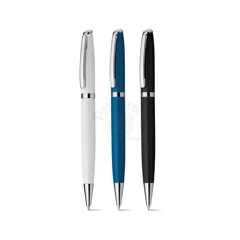 Caneta de metal personalizada com esferográfica na cor azul, clip diferenciado e acionamento da escrita por giro. Ideal para brindes promocionais e eventos corporativos.