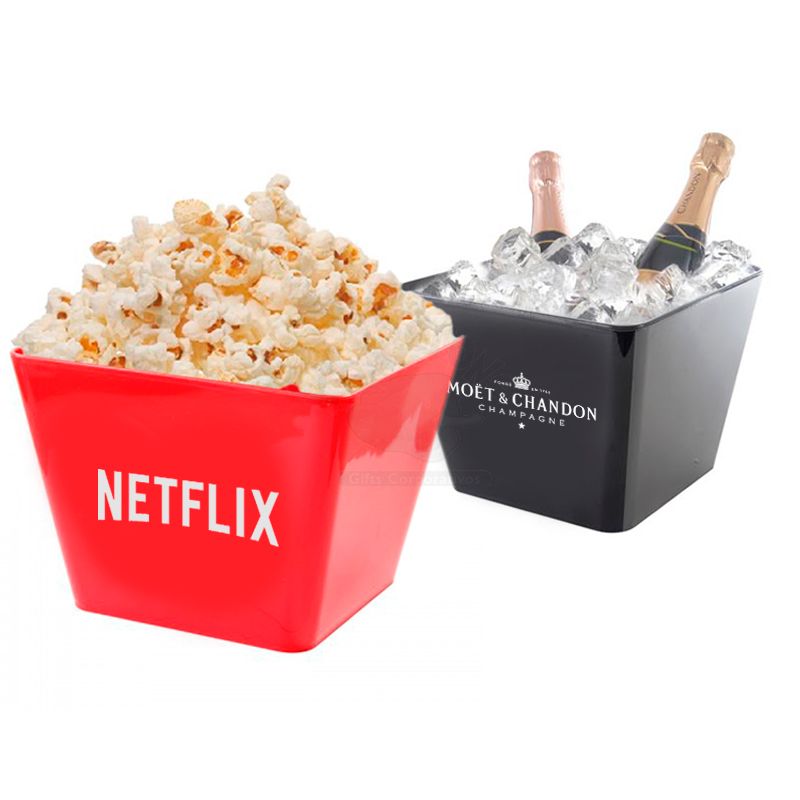 Balde de pipoca quadrado 4.5L personalizado com acabamento brilhoso. Pode ser usado também como balde de gelo Ideal para brindes corporativos, eventos promocionais, cinemas e festas. Gravação personalizada em silk 1 cor. *Demais cores sob consulta. Bebidas não acompanham o produto.