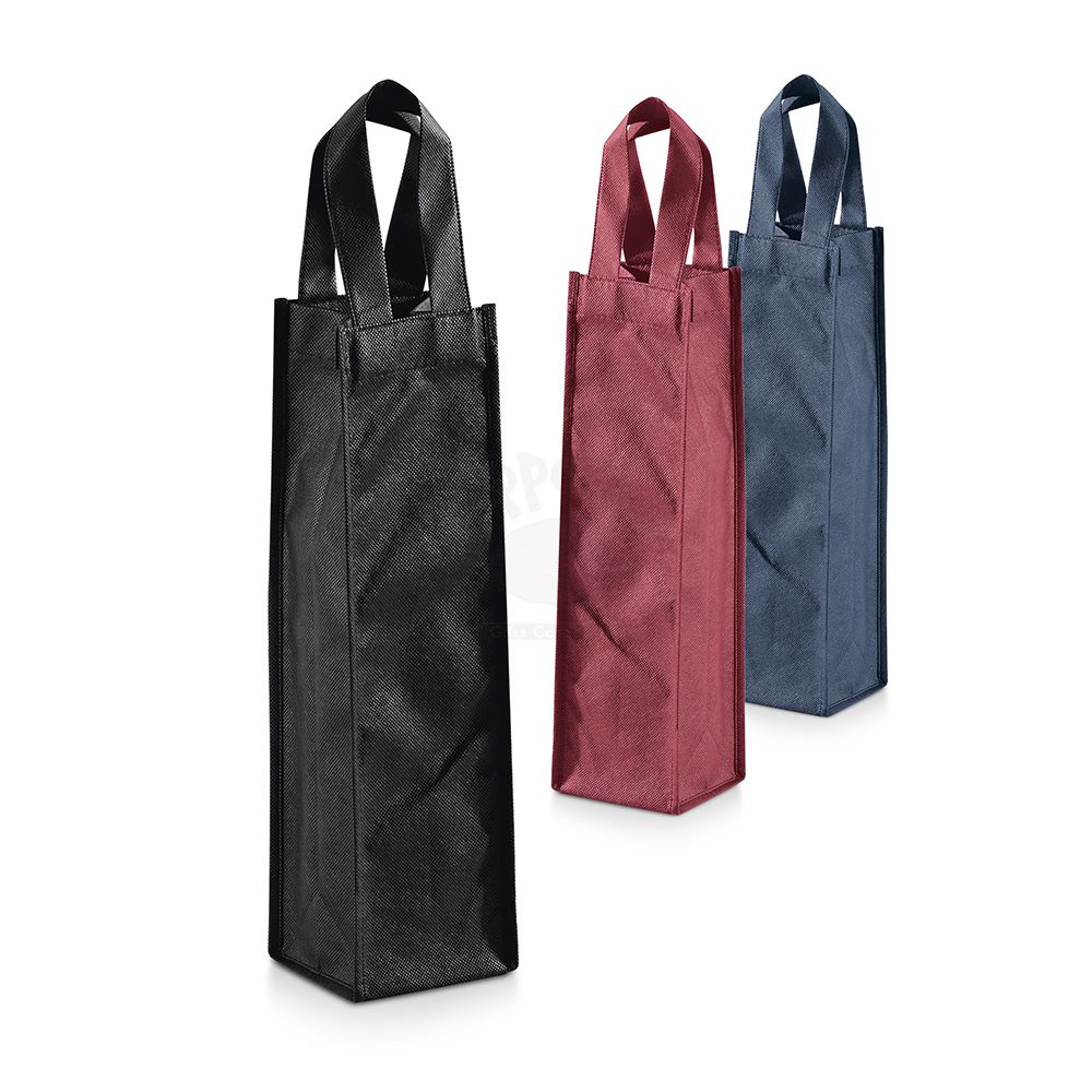 Sacola personalizada produzida em Non-woven: 80 g/m² com alça. Possui compartimento para 1 garrafa vinho/champanhe. Ideal para brindes promocionais e ventos corporativos.